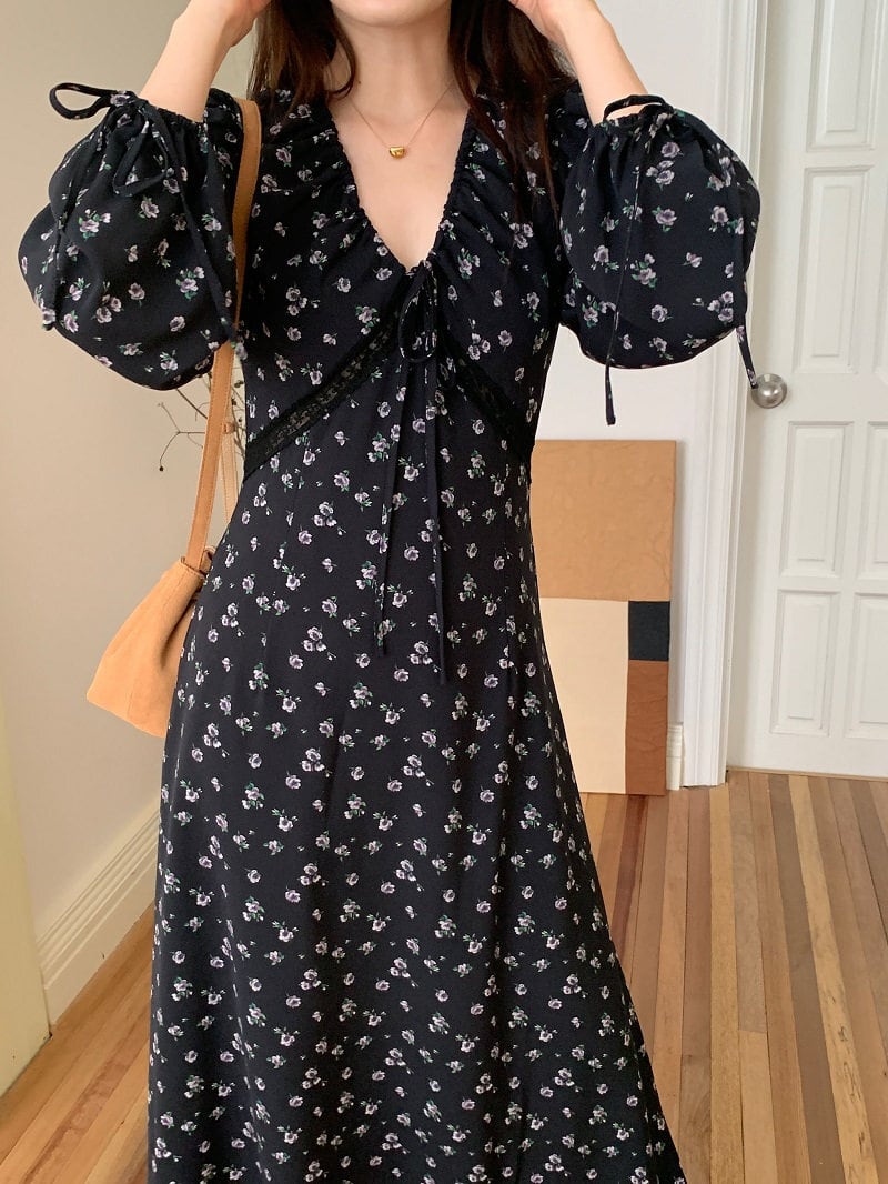 小花柄が愛らしいネイビーワンピース